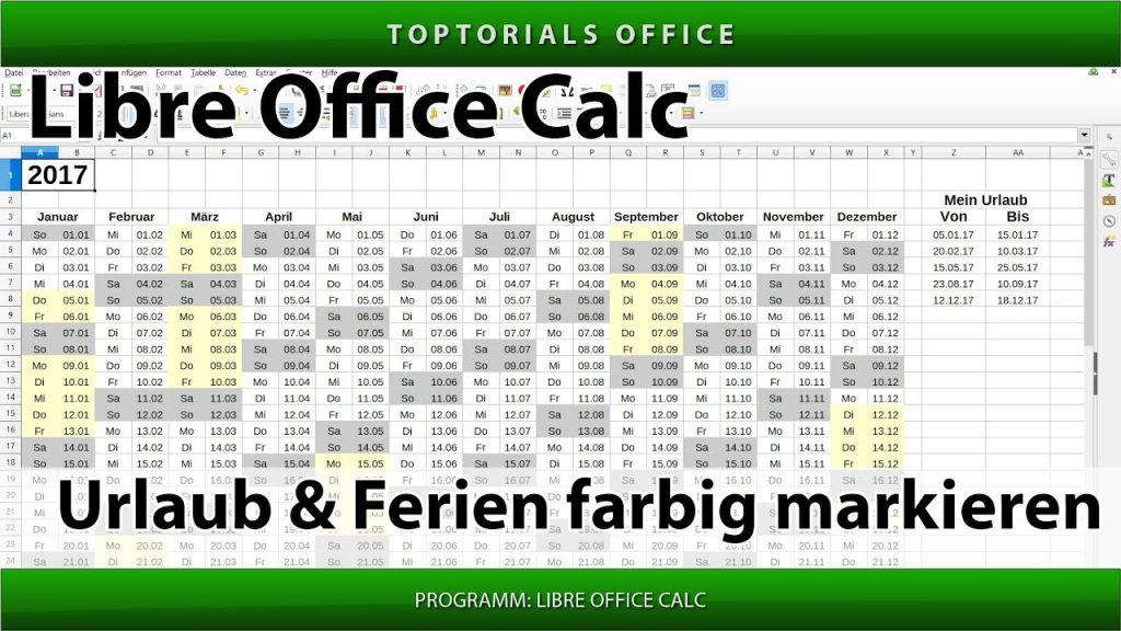 Ferien und Urlaub im Kalender farbig markieren In diesem Tutorial zeige ich Euch wie Ihr in LibreOffice Calc die Ferien oder Euren Urlaub im Kalender farbig markieren könnt. Für das […]