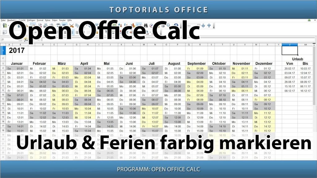 Ferien und Urlaub im Kalender farbig markieren In diesem Tutorial zeige ich Euch wie Ihr in OpenOffice Calc die Ferien oder Euren Urlaub im Kalender farbig markieren könnt. Für das […]