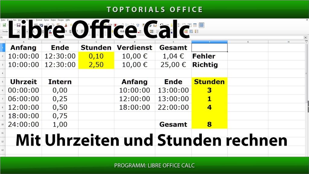 Mit Uhrzeiten und Stunden rechnen (LibreOffice Calc) In diesem Tutorial zeige ich Euch wie Ihr in Libre Office Calc mit Uhrzeiten und Stunden rechnen könnt. Dies ist eine einfache Variante und zeigt […]