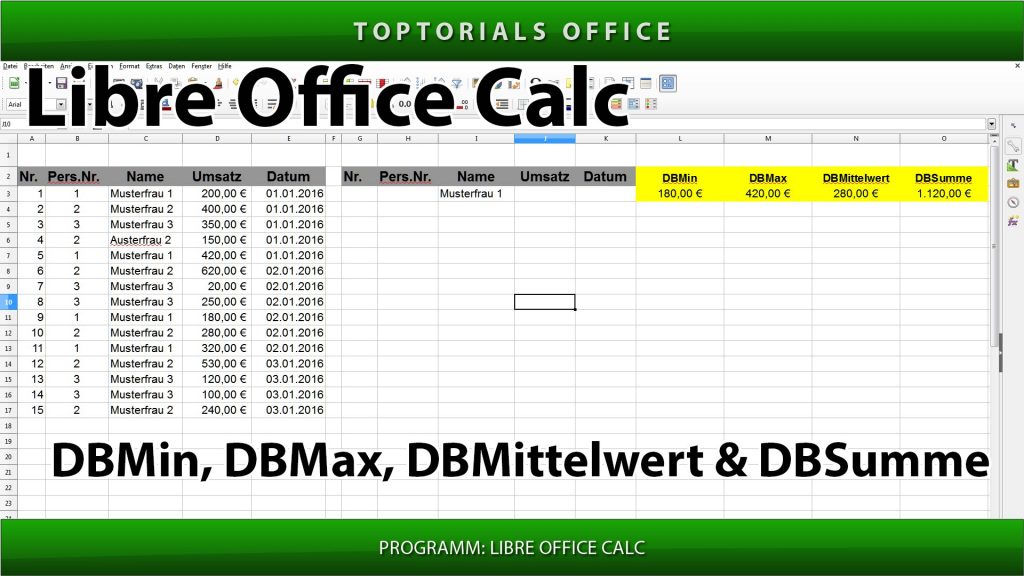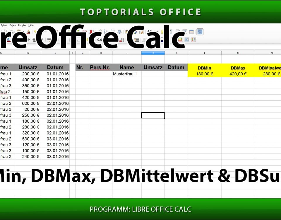 DBMin DBMax DBMittelwert DBSumme (LibreOffice Calc) In diesem Tutorial zeige ich Euch gleich mehrere Funktionen. Hier in diesem Tutorial zeige ich Euch wie Ihr die Funktionen DBMin, DBMax, DBMittelwert und DBSumme […]