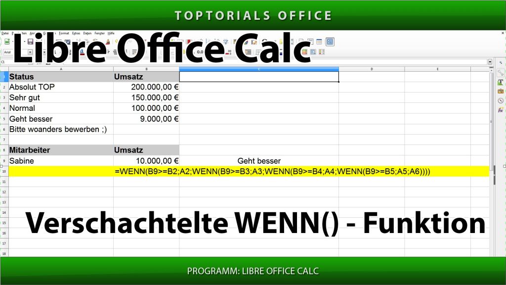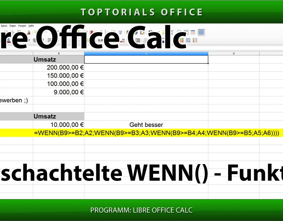 Verschachtelte Wenn Funktion (LibreOffice Calc) In diesem Tutorial zeige ich Euch wie Ihr eine verschachtelte WENN Funktion aufbauen könnt. Häufig wird die WENN Funktion auch Wenn Dann Sonst Funktion genannt. Hiermit habt Ihr […]