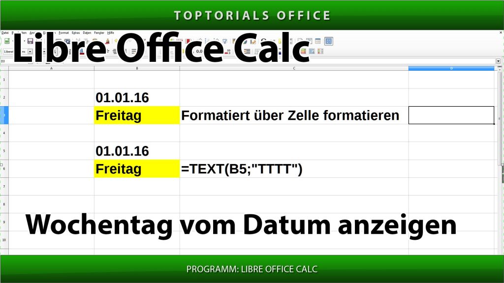 Wochentag von einem Datum ausgeben (LibreOffice Calc) In diesem Tutorial zeige ich Euch wie Ihr ganz einfach den Wochentag von einem Datum ausgeben lassen könnt. Falls Ihr noch mehr über Datum und […]