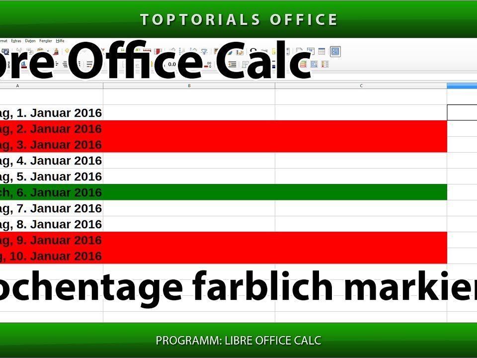 Wochentage / Wochenende farbig markieren (LibreOffice Calc) In diesem Tutorial zeige ich Euch wie Ihr in Libre Office Calc Wochentage oder Wochenenden farbig markieren könnt. Ich verwende hierfür die bedingte Formatierung. […]