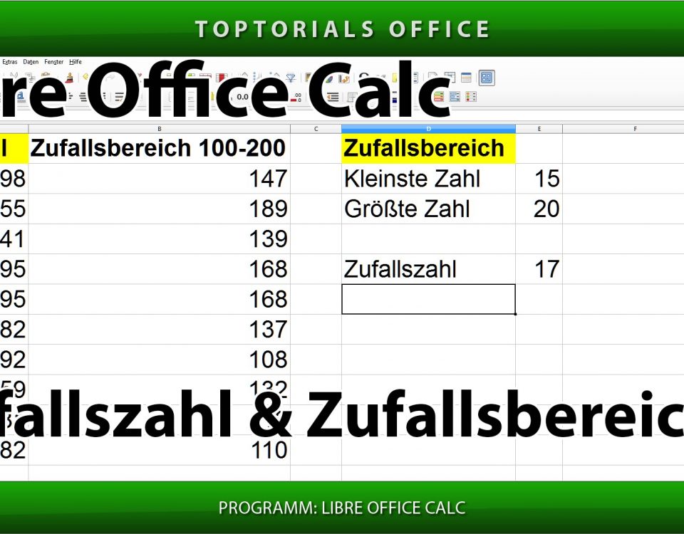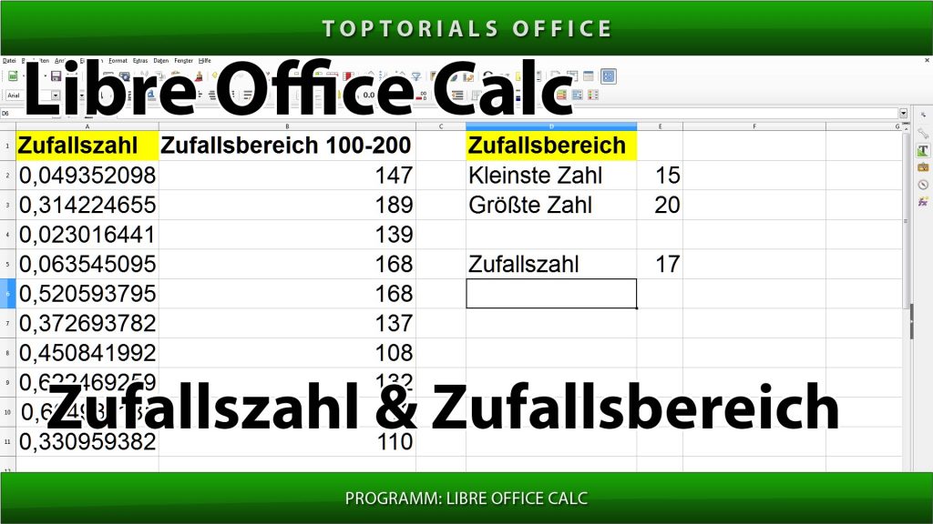 Zufallszahlen Zufallsbereich (LibreOffice Calc) In diesem Tutorial zeige ich Euch wie Ihr mit Libre Office Calc Zufallszahlen ausgeben lassen könnt. Normalerweise generiert die Funktion Zufallszahl nur eine Zahl zwischen 0 und 1. […]
