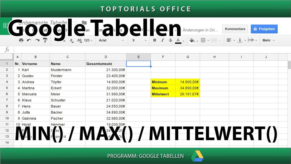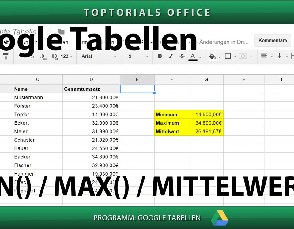 Min, Max und Mittelwert ausgeben (Google Tabellen) In diesem Tutorial zeige ich Euch die GOOGLE TABELLEN Funktionen MIN (Minimum), MAX (Maximum) und MITTELWERT. Damit erkläre ich Euch gleich 3 Funktionen […]