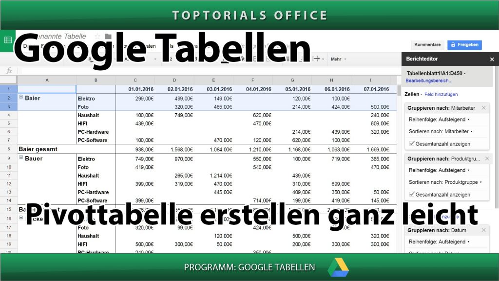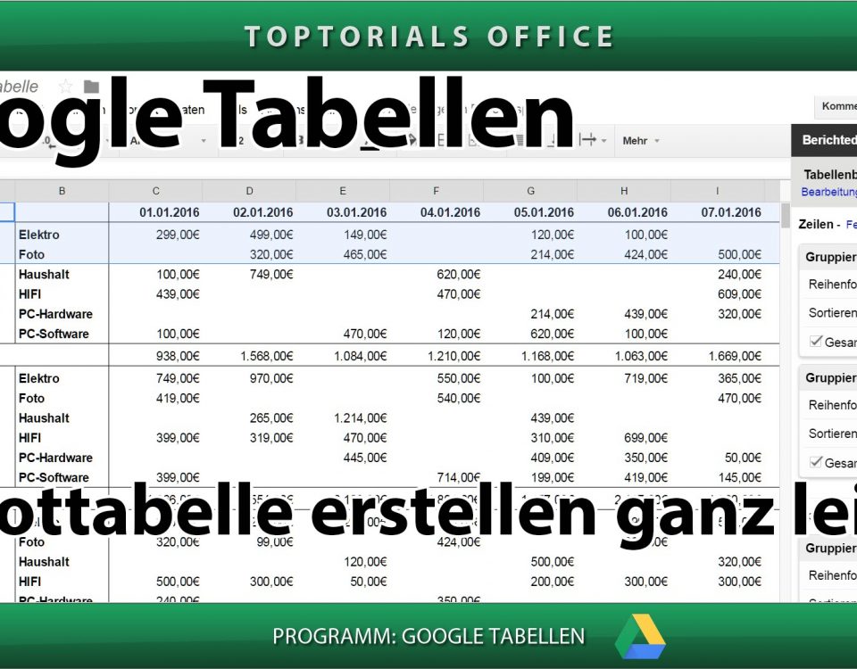 Pivot-Tabelle erstellen ganz leicht (Google Tabellen) In diesem Tutorial zeige ich Euch wie Ihr mit GOOGLE TABELLEN eine Pivottabelle / Pivottable erstellen könnt. Mit der Pivottabelle könnt Ihr innerhalb kürzester Zeit […]