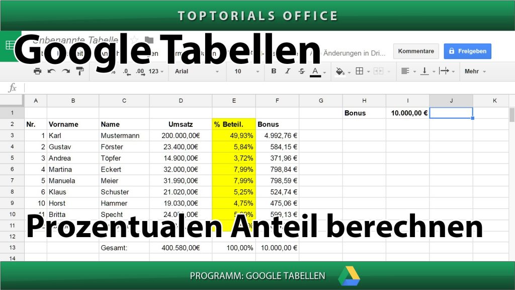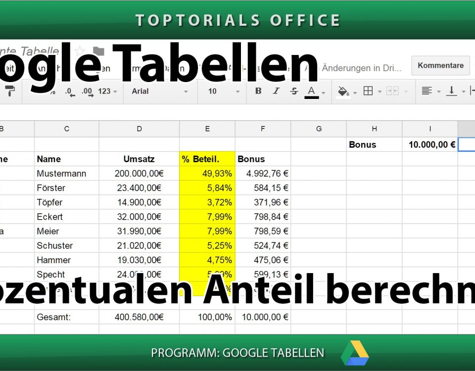 Prozentualen Anteil berechnen (Google Tabellen) In diesem Tutorial zeige ich Euch wie Ihr bei den GOOGLE TABELLEN den prozentualen Anteil ermitteln könnt. Damit könnt Ihr in einer Tabelle berechnen wie hoch der […]
